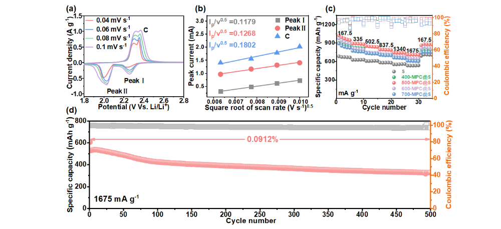 图3. MPC@S正极的电化学性能测试:(a)500-MPC@S在不同扫描速率下的CV曲线;(b)通过分析关于扫描速率的平方根的峰I、II和C的CV峰电流来研究500-MPC@ S正极所组装的Li-S电池;(c)倍率性能;(d)使用500-MPC@S正极的Li−S电池在1675 mA g−1高倍率下的长期循环性能。