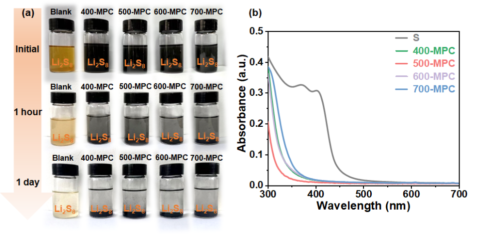 图2. 多硫化物吸附试验:(a)与400-MPC、500-MPC、600-MPC和700-MPC混合的Li2S8溶液在不同静置时间后的光学照片,(b)与400-MPC、500-MPC、600-MPC和700-MPC混合的Li2S8溶液在静置1天后的紫外-可见吸收光谱。