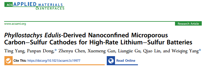 该研究以“Phyllostachys Edulis-Derived Nanoconfined Microporous Carbon−Sulfur Cathodes for High-Rate Lithium−Sulfur Batteries”为题发表于ACS Applied Materials & Interfaces。西南交通大学材料科学与工程学院硕士研究生杨婷第一作者,董盼盼副研究员和杨维清教授为共同通讯作者。