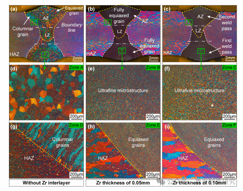 图5.锆中间层厚度(δ)对焊缝微观结构的影响:(a–c)整体微观结构;(d–f)焊缝中心A、B、C区的放大视图;(g–i)热影响区(HAZ)D、E、F区的放大视图。