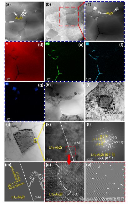 图8.通过透射电子显微镜(TEM)对焊缝中心 δ 0.05mm处的显微组织特征分析:(a) HADDF 暗场图像,(b) HADDF 明场图像,(c)(b)框选区域的放大视图,(d–g)Al、Mg、Si、Zr的元素分布图,(h)晶界处Al3Zr相,(i)Al3Zr析出物附近的位错线,(j)晶内Al3Zr相,(k)(j)标记区域的高分辨率图像,(l)(h)标记区域的 SAED 形貌,(m)界面处的高分辨率图像,(n)(k)框选区域的放大视图,(o)边缘位错。