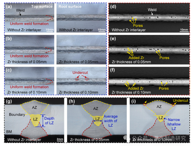 图2.锆中间层厚度(δ)对焊缝形成的影响:(a–c)表面形貌,(d–f)X射线 NDT 结果显示的焊缝孔隙率,(g–i)横截面形貌,其中AZ为电弧主导熔化区,LZ为激光主导熔化区。