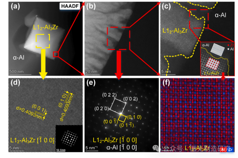 图9.焊缝中心球面像差分析结果(δ 为0.05毫米):(a) HAADF 明场图像,(b)(a)中红色方框的放大视图,(c)(b)中方框的放大视图,(d)(a)中黄色方框的高分辨率图像,(e)(b)中方框的 SAED 图案,(f)L12-Al3Zr的原子分辨率EDS光谱。(关于图例中颜色标注的解释,请参阅本文网络版。)