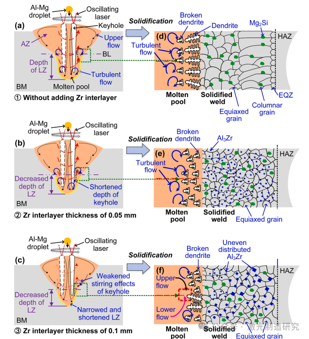 (1)焊缝中激光主导熔化区(LZ)的深度相对于未添加Zr的情况有所降低。当Zr中间层厚度分别为0.05毫米和0.1毫米时,LZ深度分别减小约11.7%和21%。在中间层厚度为0.1毫米时,平均LZ宽度也缩短了35%。然而,过量引入Zr会导致其在局部焊缝区域偏析,降低成分均匀性。