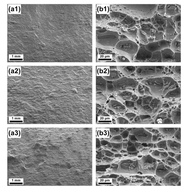 图13.不同Zr中间层厚度(δ)下焊接接头的拉伸断裂形貌:(a1-b1) δ =0mm,(a2-b2) δ =0.05mm,(a3-b3) δ =0.10mm。