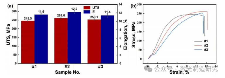 (2)添加0.05毫米Zr中间层后,焊缝上部电弧主导区(AZ)和下部LZ的晶粒尺寸分别细化86.4%和86.0%,等轴晶比例分别提高至89%和92%。焊接接头的极限抗拉强度和延伸率分别达到261.6 MPa和12.2%。此外,焊缝平均硬度为96.5 HV,较未添加Zr时提高了18.4%。