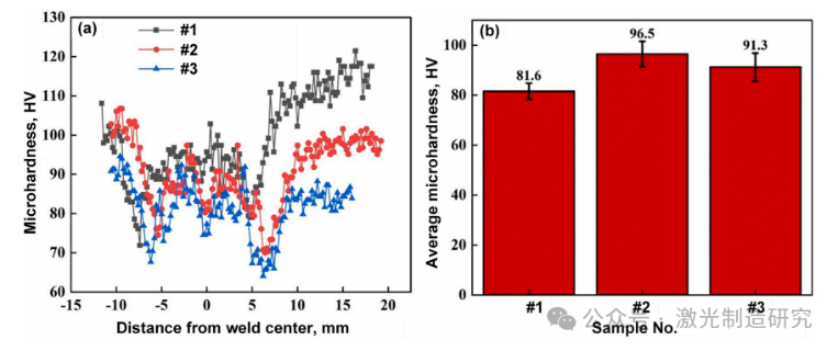 图14. 不同Zr中间层厚度下焊接接头的显微硬度分布:(a) 显微硬度分布,(b) 平均显微硬度。